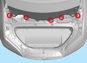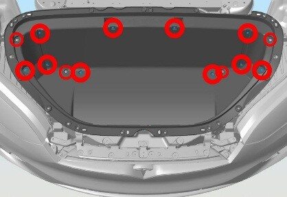 Note(x4) clips, (x2) patch bolts, T25, 2.5 Nm. Discard after removal.