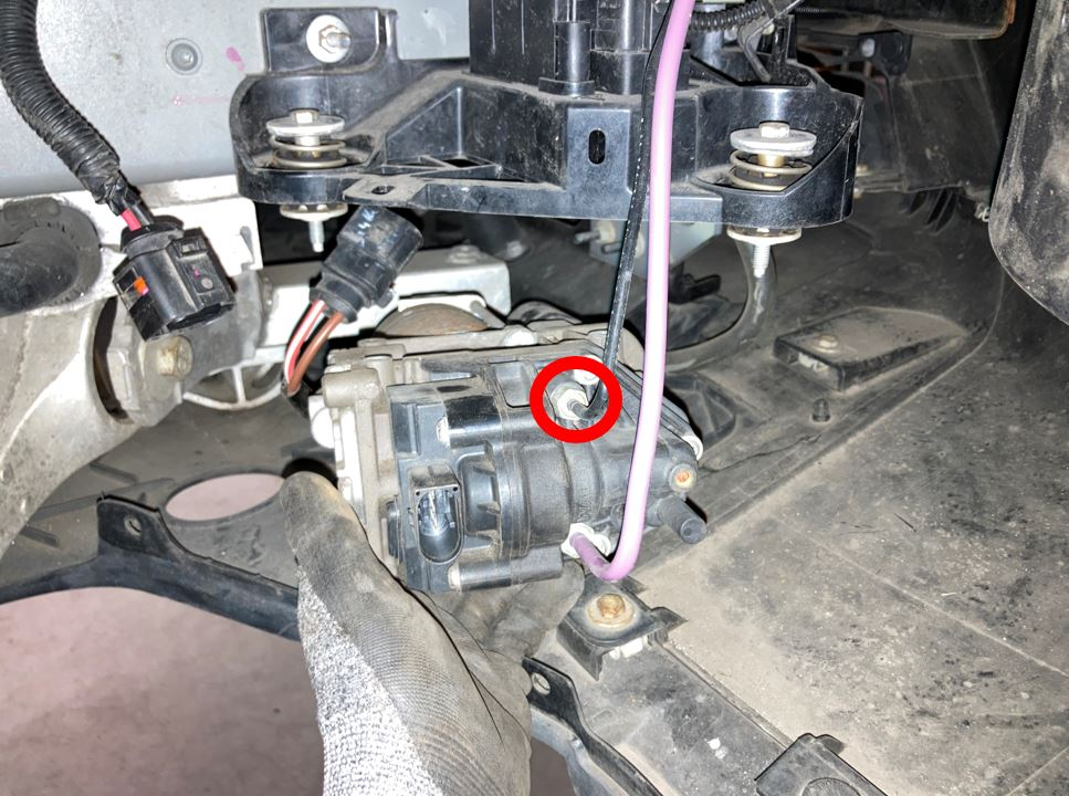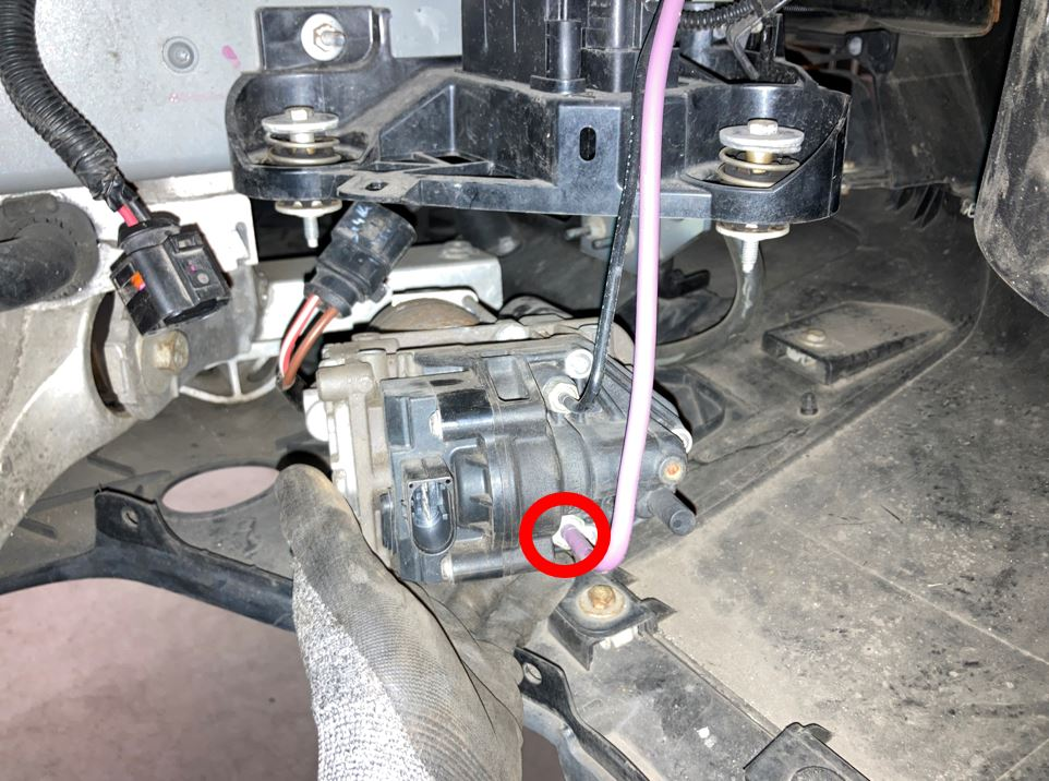 - Remove the bolts (x3) that attach the air suspension compressor to the support bracket and gently lay the compressor on the aero shield.