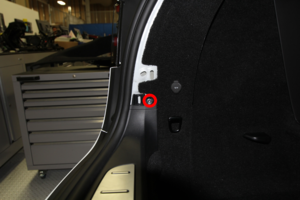 Pull rear lower corner of RH trunk side carpet panel out and downwards to remove panel
