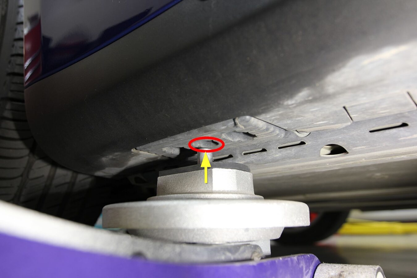NotePosition jack stand adapter onto jack and position on vehicle lift pad so that pin is located in center hole of vehicle lift pad, Jack up and position jack stand under vehicle, Lower jack so jack stand adapter is centered on jack stand