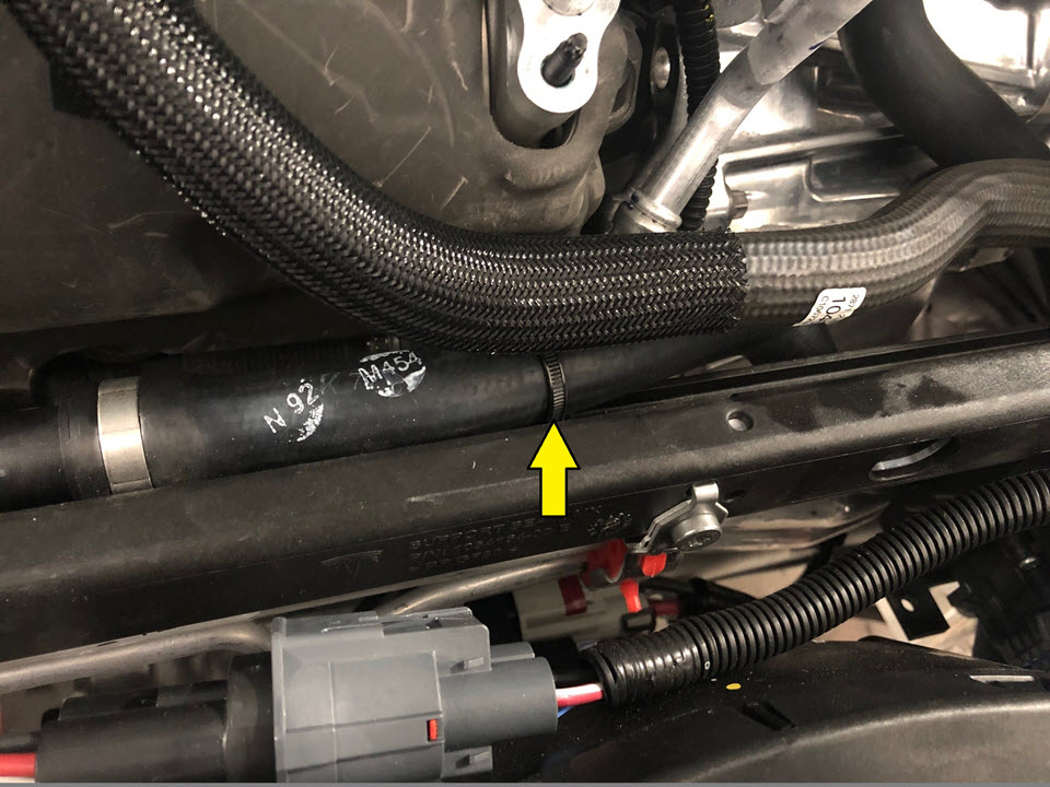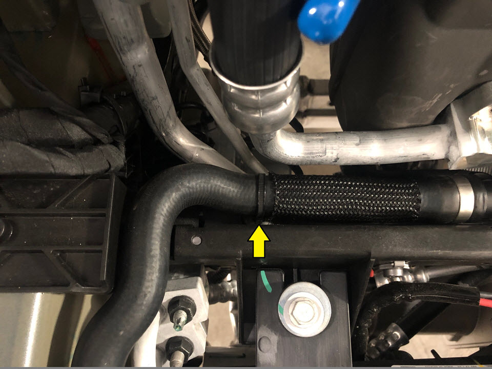 Remove the retaining clips (x2) that attach the front drive unit outlet hose to the support beam.