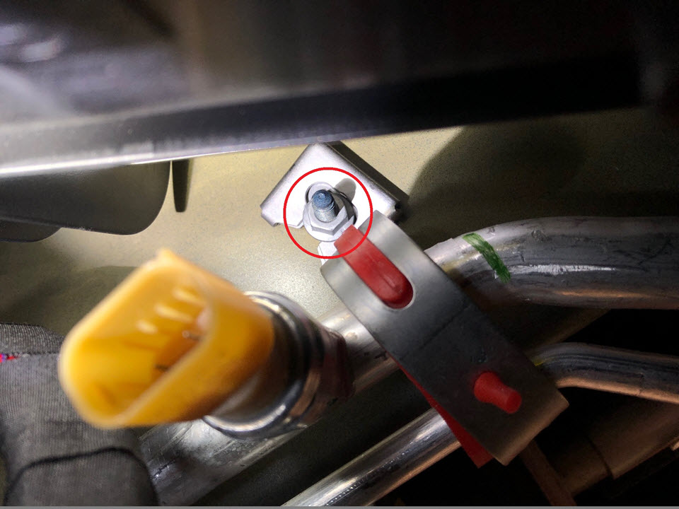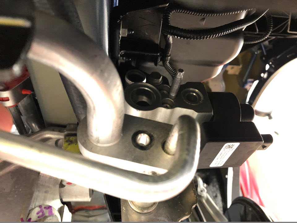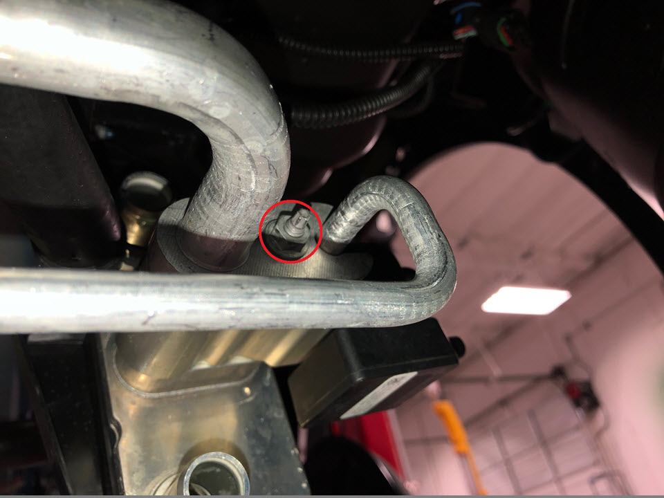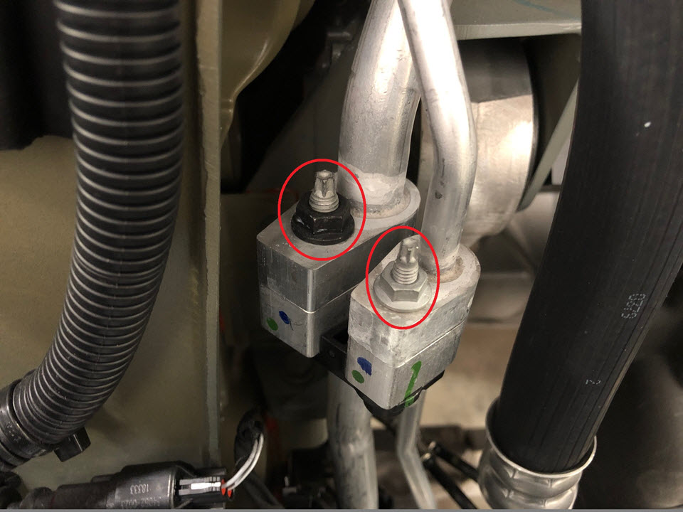 Remove the bolts (x2) that attach the suction liquid jumper A/C line to the support beam (torque 5 Nm).