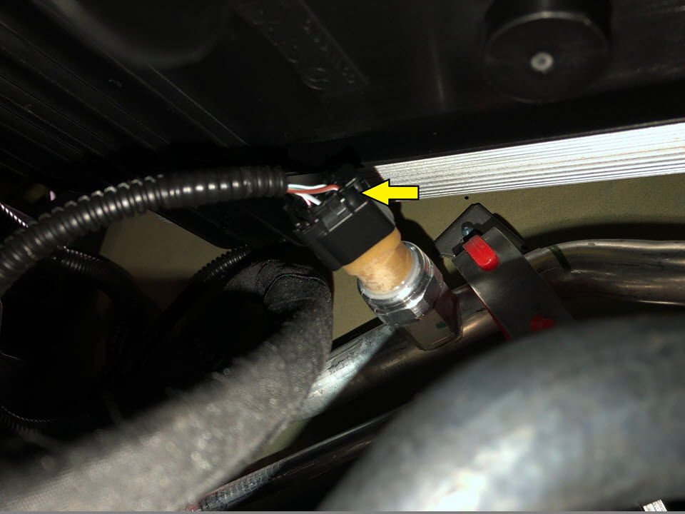 Disconnect the pressure sensor electrical connector on the suction liquid jumper A/C line.