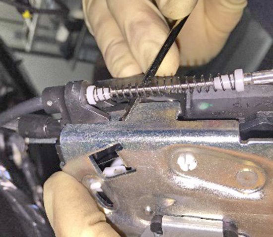 Use a pick to release the cinching cable from the retaining clip on the latch