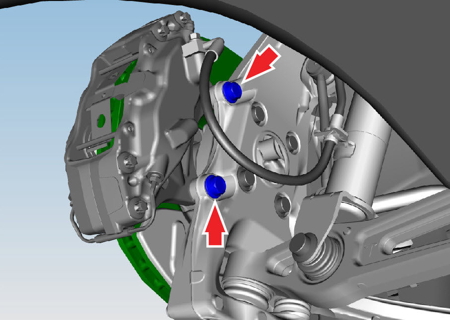 Remove and discard the bolts (x2) that secure the caliper to the knuckle (torque 120 Nm).