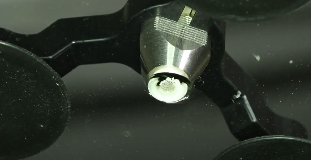 Turn the resin injector piston clockwise until the resin appears just above the bottom of the white seal.