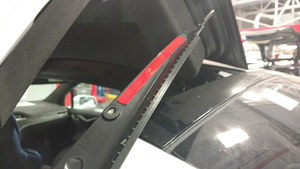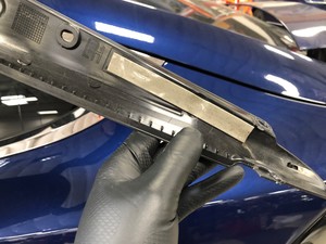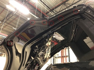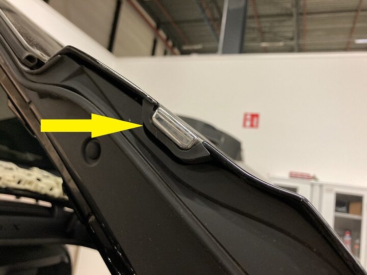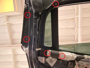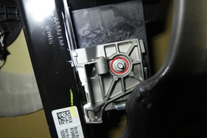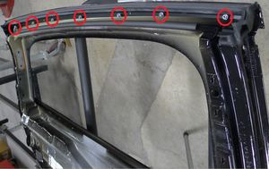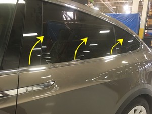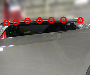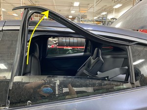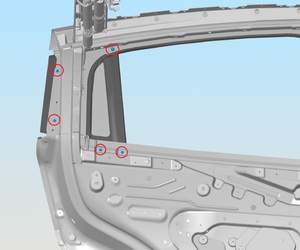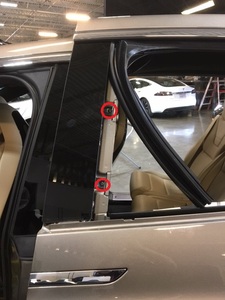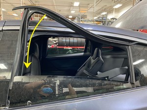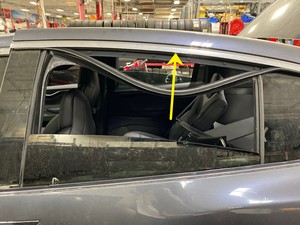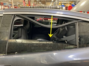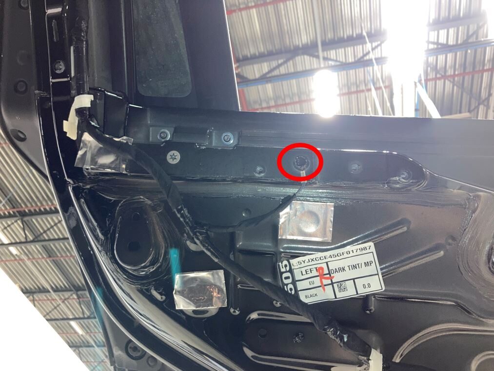 Note5x patched screws, T25, 3.5 Nm. Install new patched bolts. Carefully lift up the airbag to access the lower screws, Place upper edge of fixed glass assembly in between cantrail seal. Position fixed glass to lineup with the rivet nuts, and then insert and secure the fixed glass seal onto door assembly.