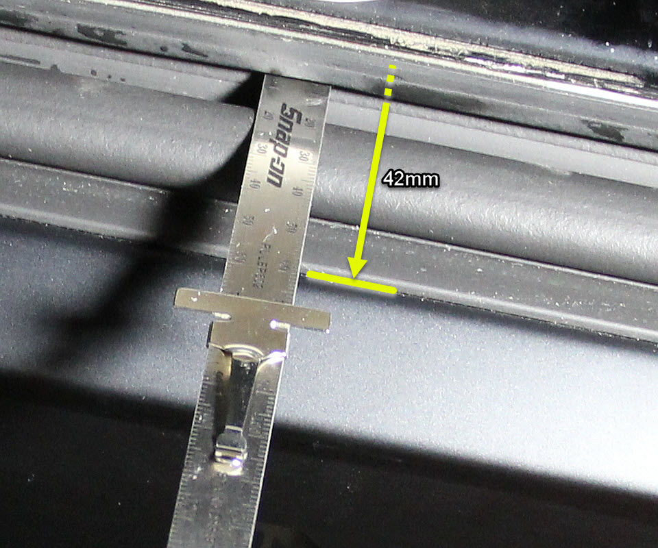 From the rear of the vehicle, sight along the top of the primary door seal and the applique seal, at the vehicle spine.