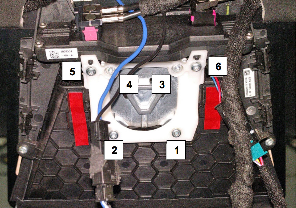 Install the triple camera rear view mirror mount plate with integrated pitch adjustment onto the glare shield. Install the 6 fasteners in the order shown (torque 0.8 Nm).