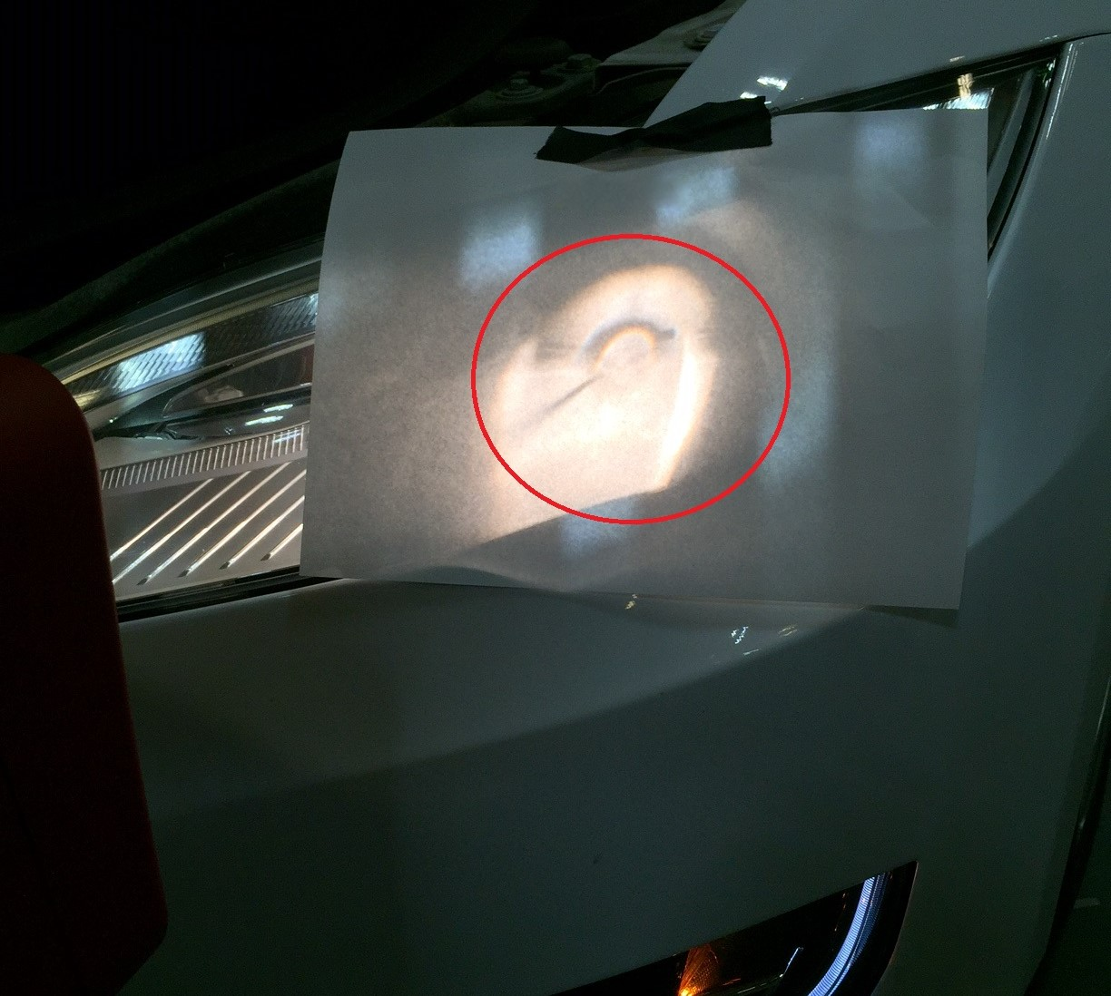 Put a sheet of white paper onto the LH headlamp to aid in locating the focal point of the headlamp.