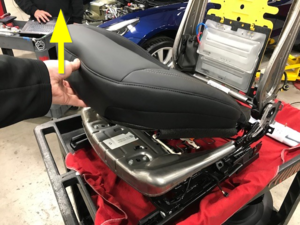 NoteLift up at the front of the seat cushion and pull up to remove seat cushion from seat bottom frame, Ensure harness connectors do not catch on seat bottom frame when removing