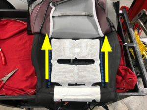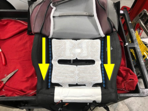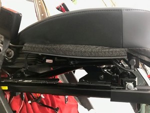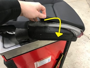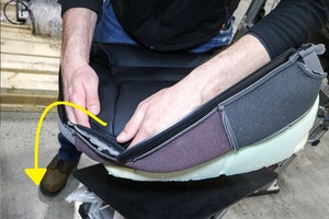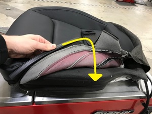 Firmly press both sides of seat bottom upholstery velcro into inboard channels of seat cushion foam