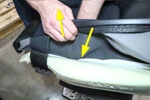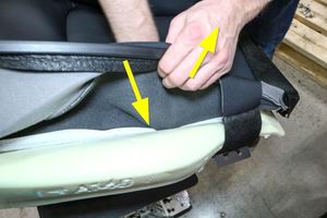 NotePull the seat bottom upholstery trim back with one hand and push on the Velcro from inside with the other, Push the Velcro into the channel until it is firmly attached, Working your way from back of seat cushion foam to the front