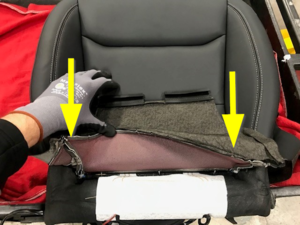 Roll RH seat bottom upholstery front corner and then side over seat cushion foam