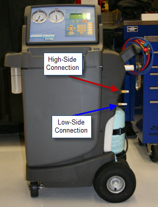 - Connect the high-side (red) hose and low-side (blue) hose from the HVAC machine to the vehicle’s high-side and low-side service ports.
