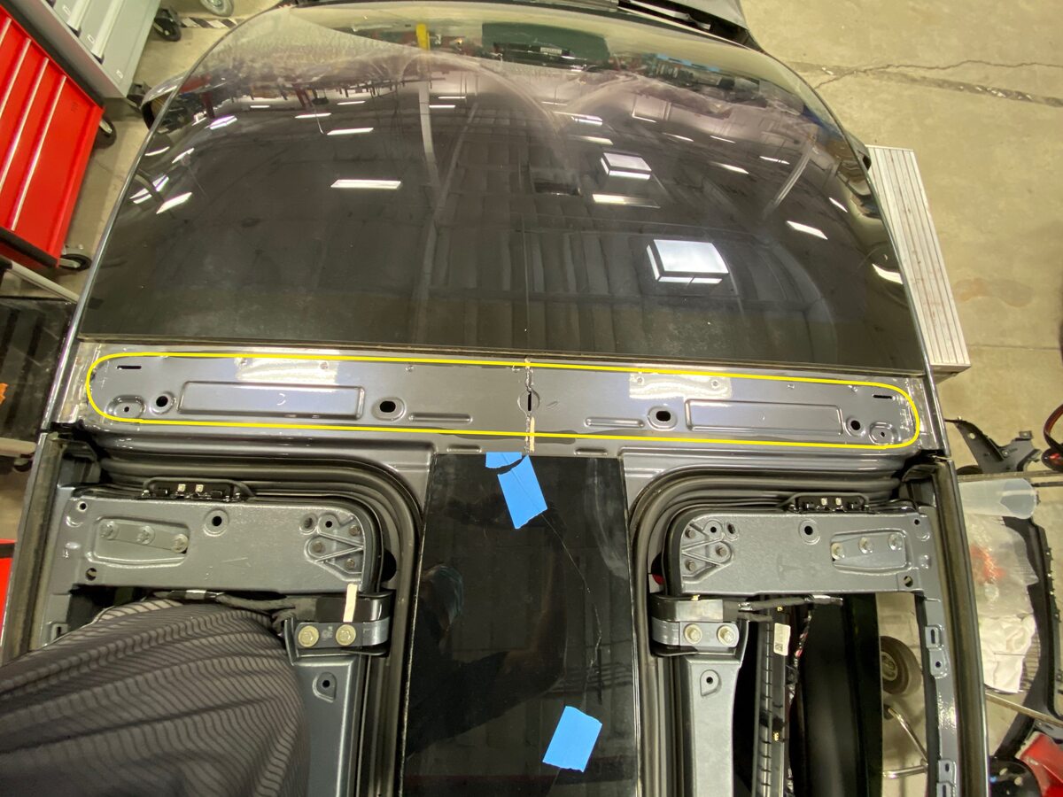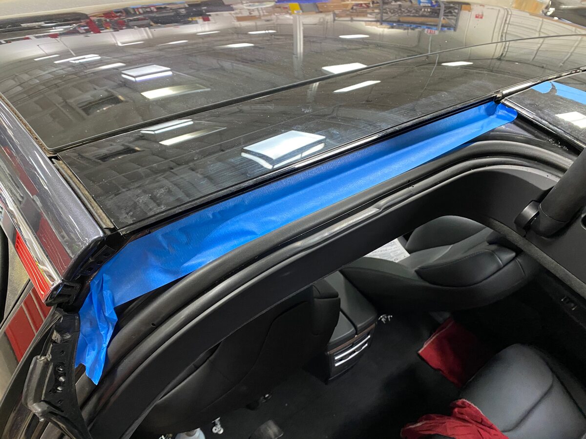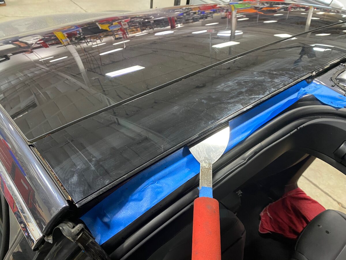 Use a glass cutting blade to release the front roof applique from the vehicle.