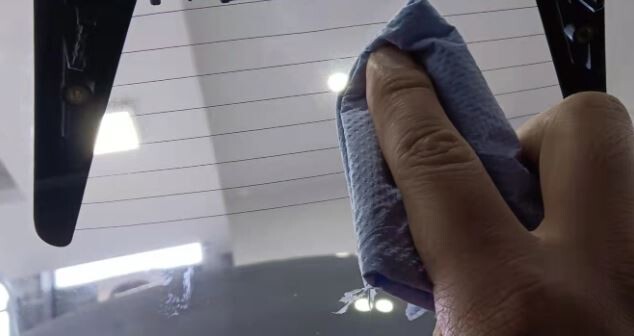 If there is no foam tape applied to the glare shield, cut pieces of 6 mm x 30 mm double-sided foam tape and apply them to the glare shield.
