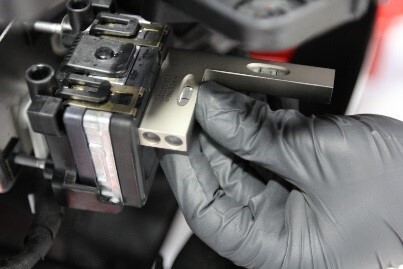 NoteCheck the bubble on the long portion of the bubble tool. The radar sensor is calibrated vertically if the bubble is centered between the black lines. If necessary, adjust the vertical set screw until the bubble level indicates vertical calibration has been achieved, labeled 2 in attached image.