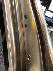 The studs should line up with the two round holes, the elongated hole is not used for this part