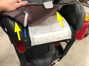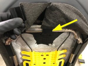 21. Remove the lower flap covering the outboard corner of the seat back frame