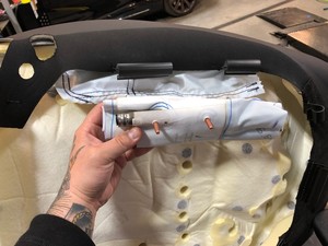 Pull the seat back cover away from foam assembly to access the air bag, Slide the air bag out of the envelope, Ensure the studs are clear of the envelope before removing, If the air bag is pulled straight out with the studs in the holes, the envelope will be damaged