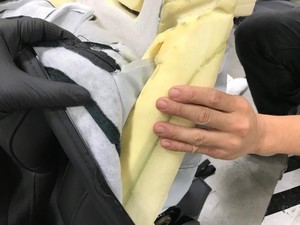 Start by sliding the foam trim straight onto the seat back frame, Ensure the posts for the headrests engage the seat back foam, Ensure the heater harness and lower trim that engages the frame are pushed through to the back side of the frame, Ensure that both sides of the seat back cushion overlap the seat back frame