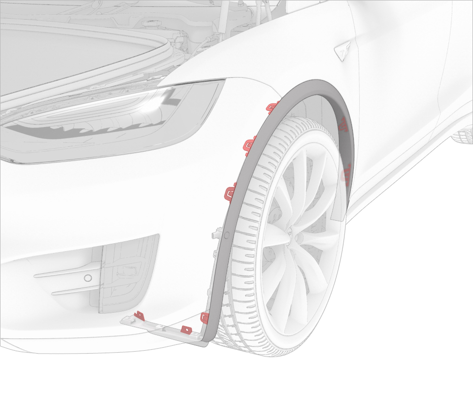 Release the clips (x8) that attach the front half of the LH front fender garnish to the vehicle.