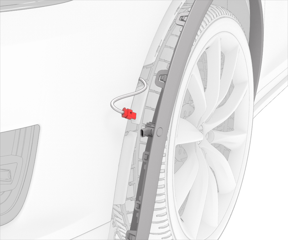 Carefully flex the front half of the LH front fender garnish outwards, and then disconnect the electrical connector from the LH front fender garnish park assist sensor.