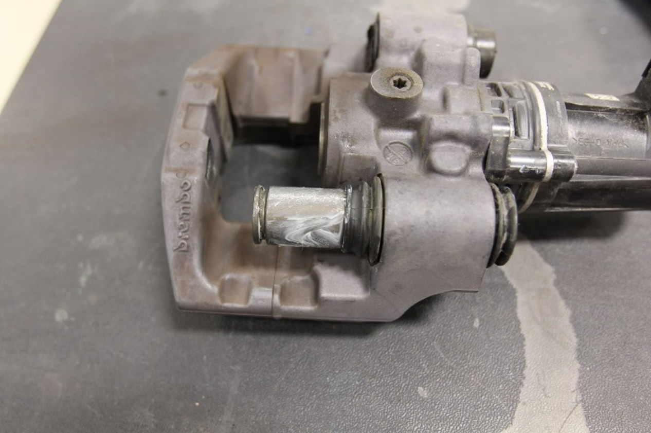 43. Use the brush and Tesla–approved brake cleaner to clean the abutment flats, the piston faces, the inner surfaces of the LH parking brake caliper, the retaining pins, the anti-rattle springs, and the brake pad edges and surfaces that contact the caliper.