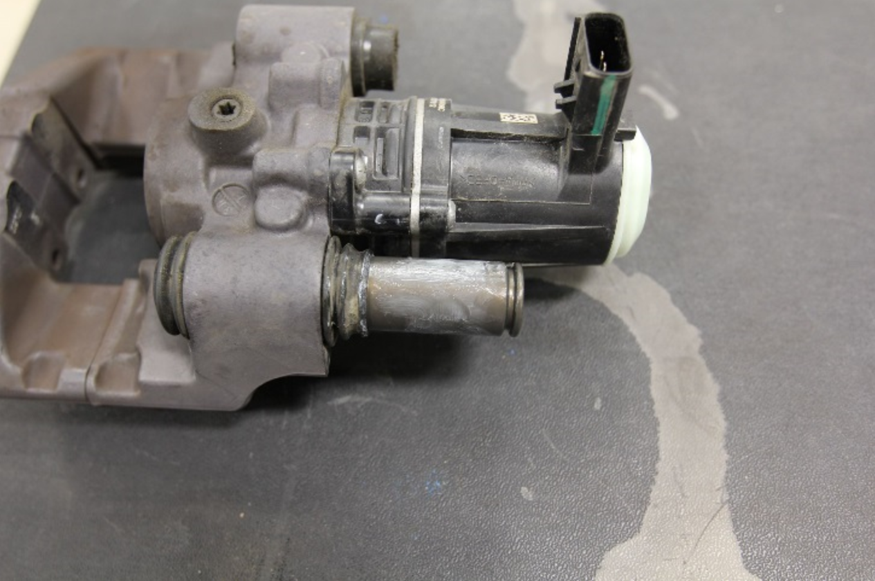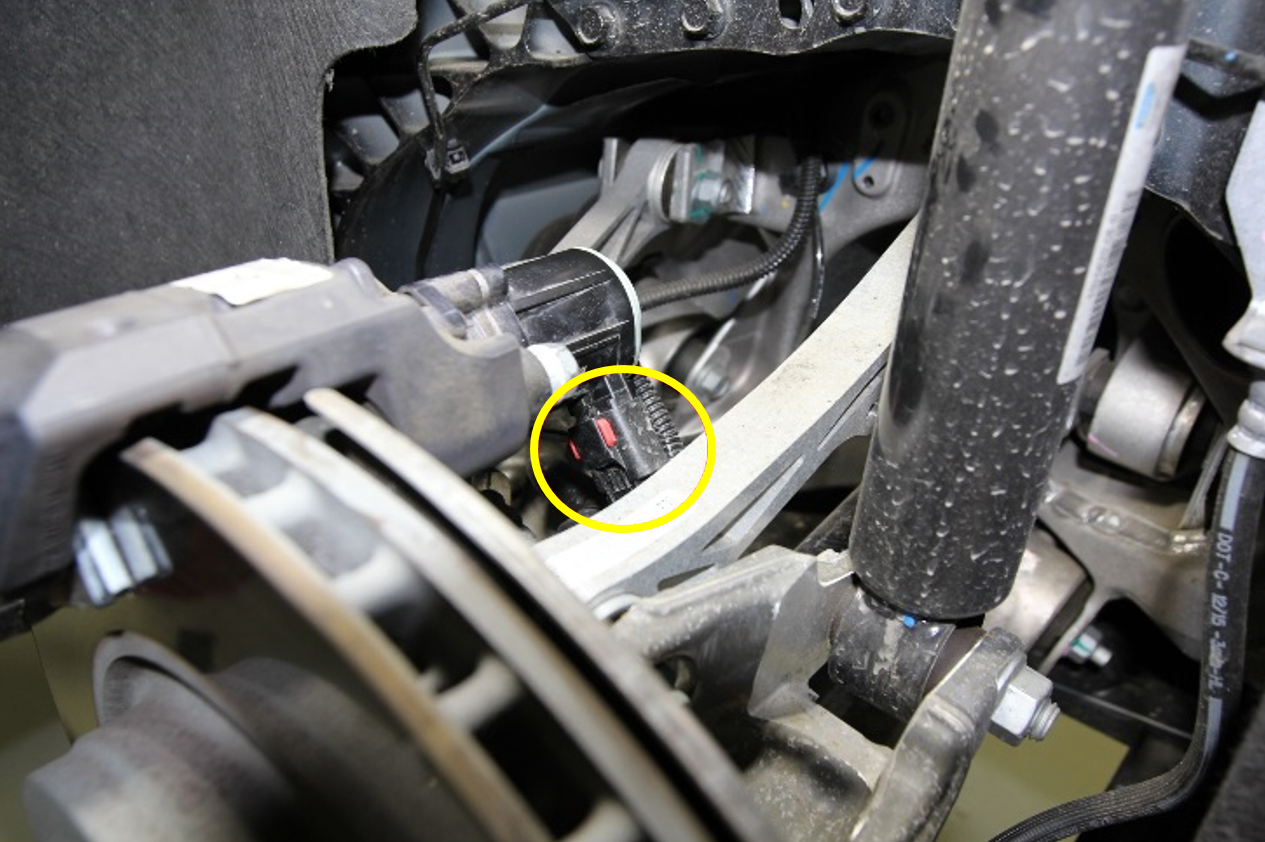 28. Use a brush and Tesla–approved brake cleaner to clean dirt and debris from the outside of the LH parking brake caliper connector and harness at the LH rear wheel.