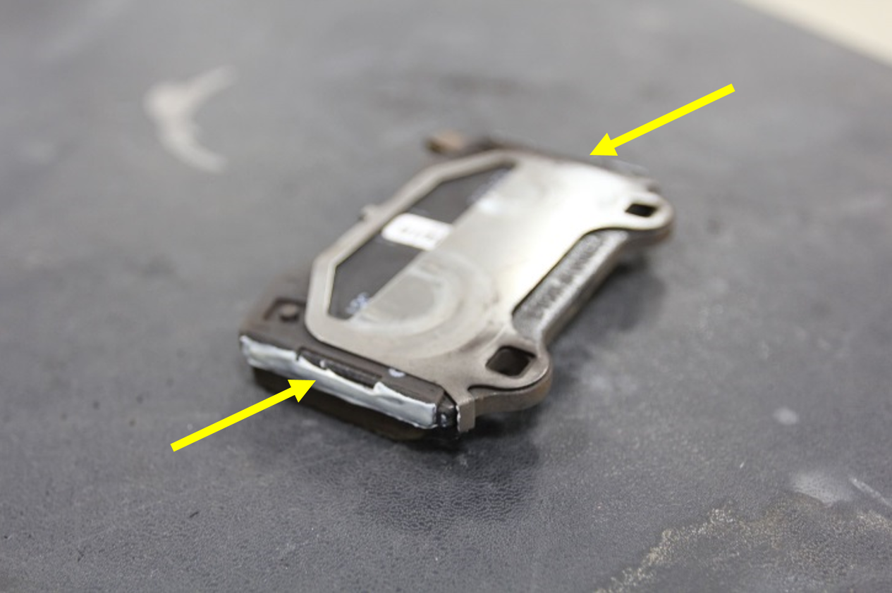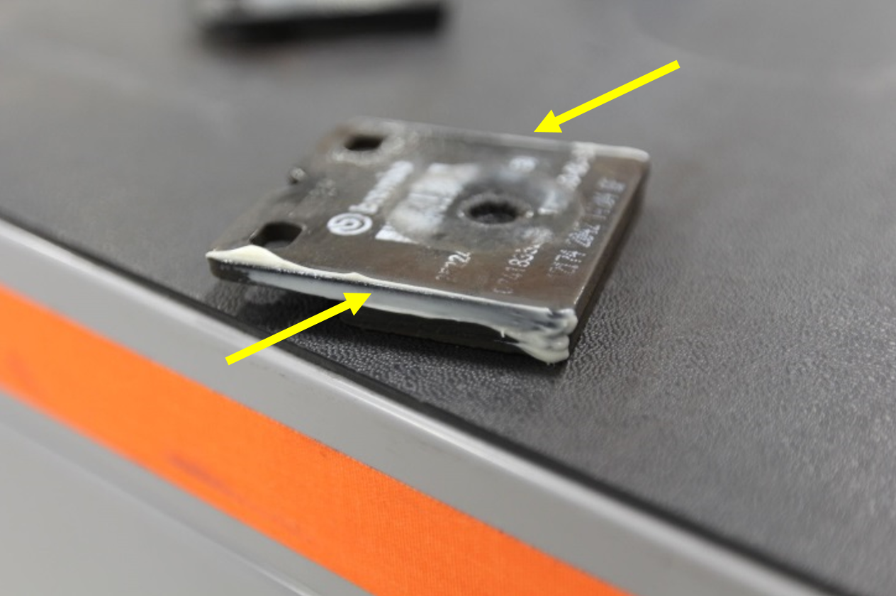 21. Apply a thin layer of Tesla-approved brake caliper lubricant to the brake pad edges that contact the abutment flats.
