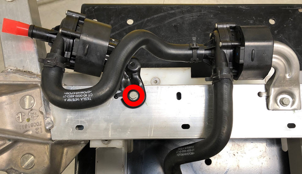 attaches the battery coolant pump 1 to the battery coolant pump 2 hose-to-battery