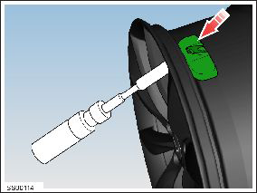 - Remove the nut that secures the valve to the wheel. Remove both the valve and wheel sensor.