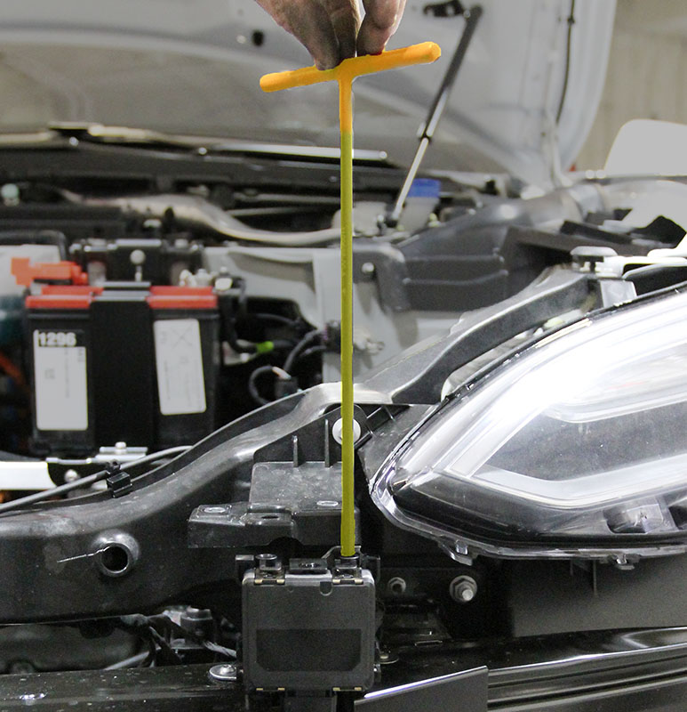 Check the bubble on the long portion of the bubble tool. The radar sensor is calibrated vertically if the bubble is centered between the black lines.