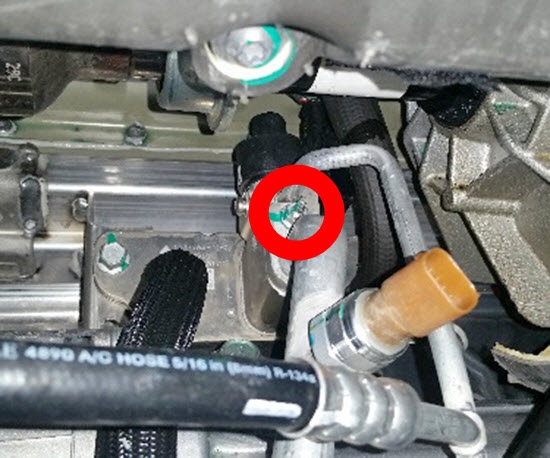 Remove the nut that secures the condenser-to-chiller low pressure pipe to the charge port