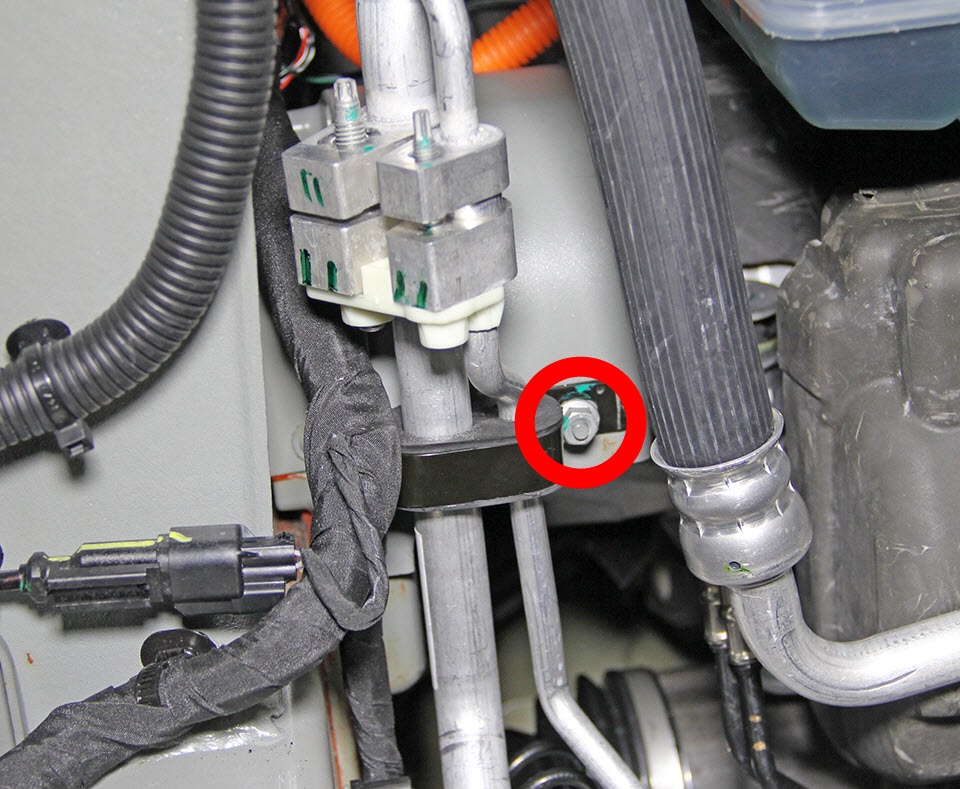 Remove the nut that secures the condenser-to-chiller high pressure pipe to the