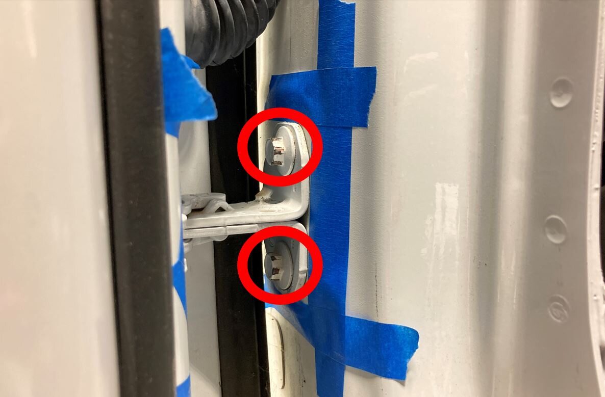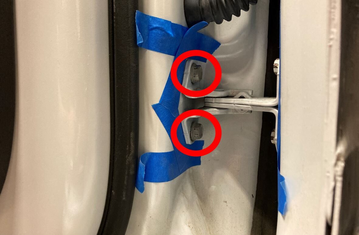 LH front door lower hinge to the door assembly (torque 24 Nm).