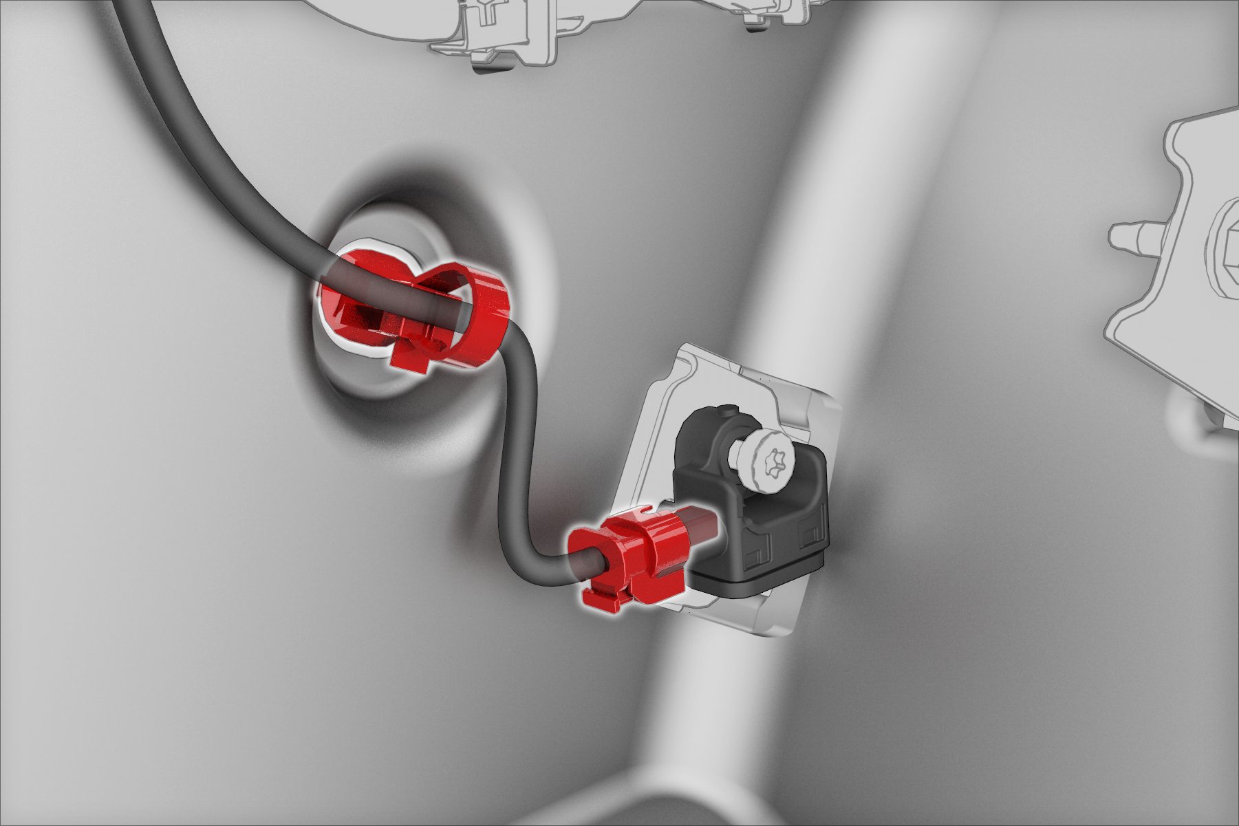 - Disconnect the rear LH D-pillar harness connectors (3x electrical harness connectors, 4x coax connectors), and then release the clips that attach the LH rear harnes to the body.