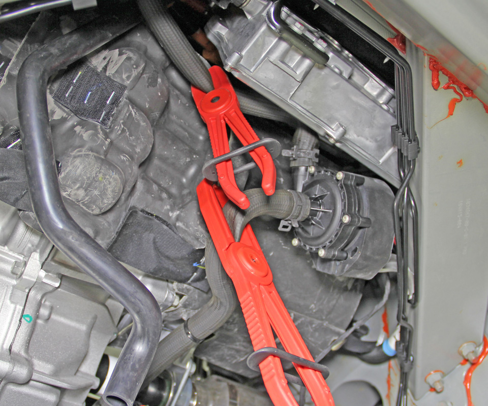 Clamp the coolant pump hoses, but do not release the hoses at this time.