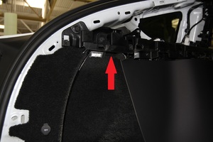 Release clips securing rear edge of RH C-pillar lower panel to rear trunk side carpet panel and pull top edge of C-pillar lower panel out