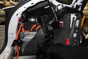 Pull rear lower corner of LH trunk side carpet panel out and downwards to remove panel