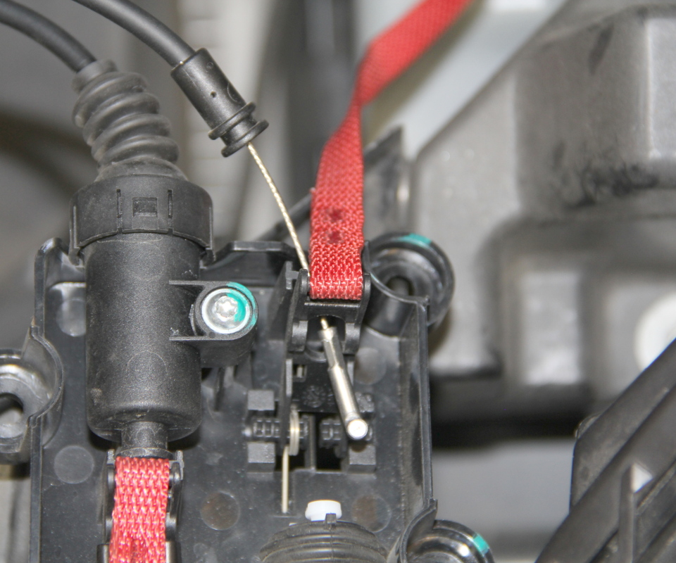 Move the primary cable through the slit in the side of the black cap, and remove the cap from the vehicle.