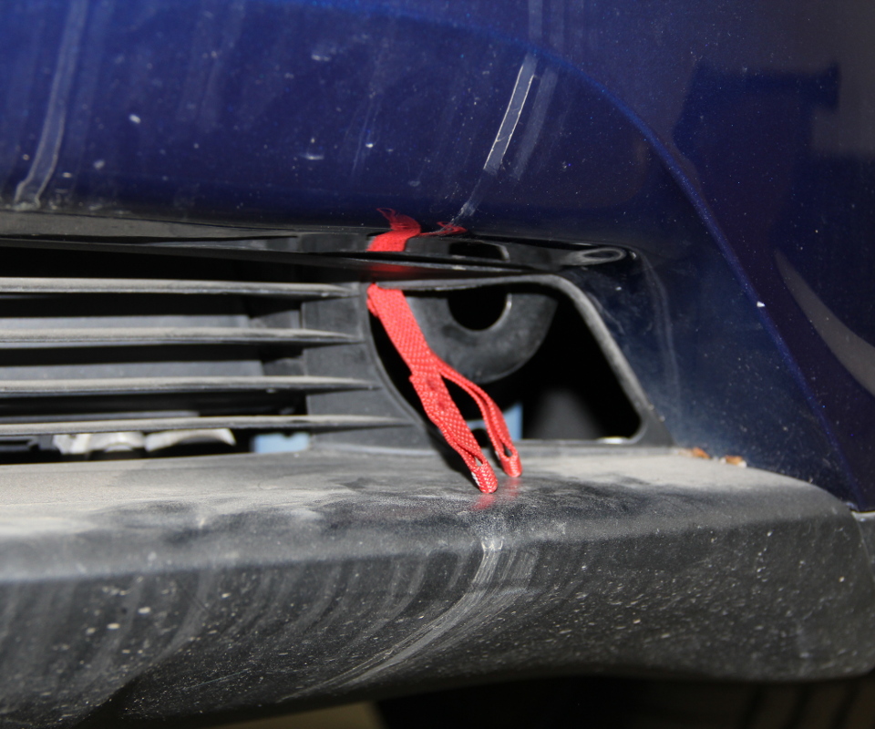 Release the straps from the tow hook cover and move them through the tow hook opening.