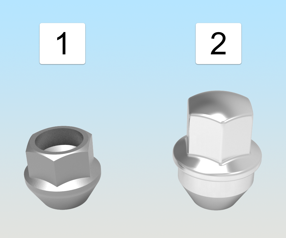 1 Short lug nut 2 Tall lug nut -