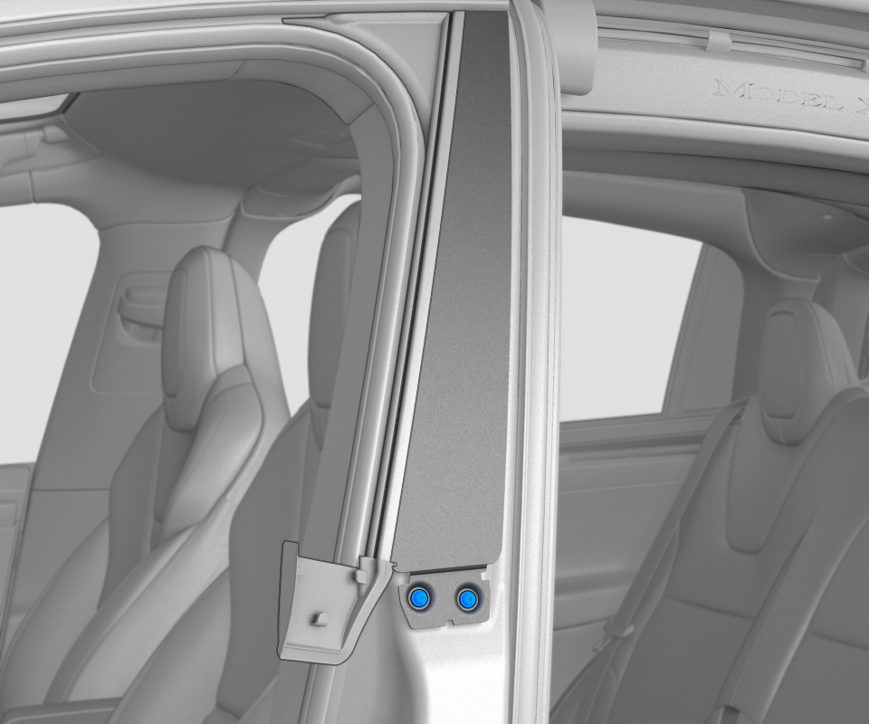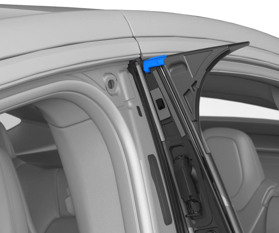 Install the LH B-pillar applique by first inserting the top tab, and then pushing up to attach the lower clip.