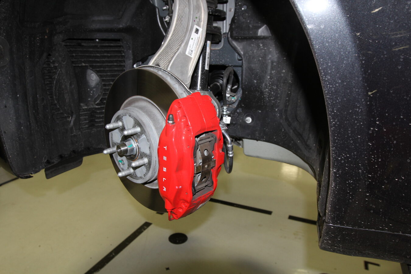 Position and install LH front brake caliper onto LH front knuckle assembly.
