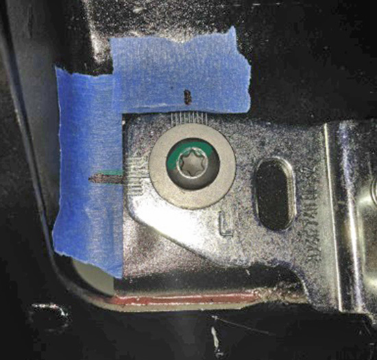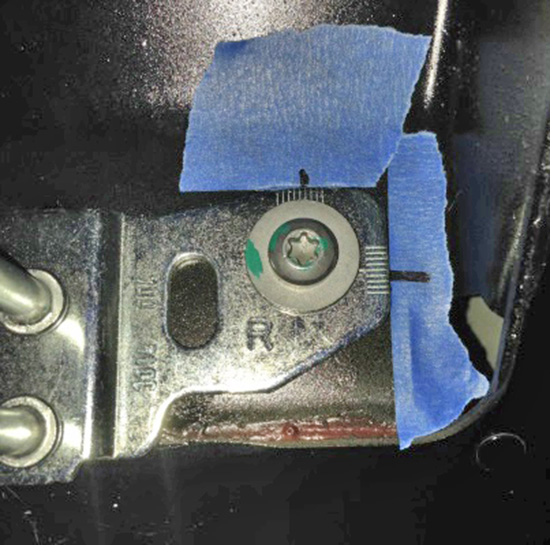 - Position the striker so that it aligns with the tape. Install the striker bolts loosely.