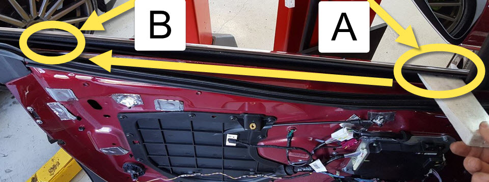 NoteUse a plastic trim tool to remove the outer belt seal from the door while preventing to remove brightwork.NoteA gentle rolling of the belt seal towards the outer panel side of the door shell will be felt when releasing the outer belt seal from the door.