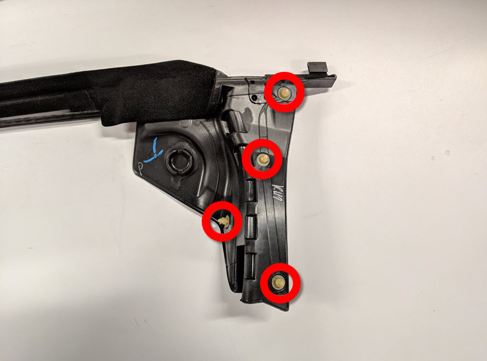 Remove the pins (x4) from the rear molding of the new inner belt seal using diagonal cutters.