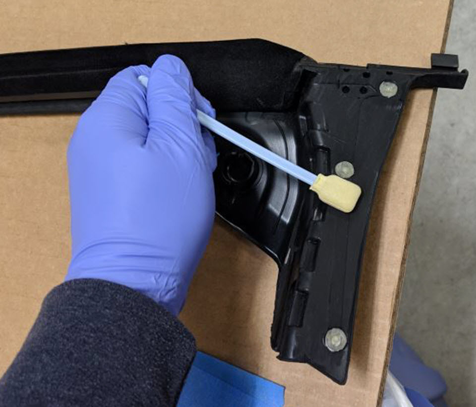 Clean the debris from the surface of the rear molding seal using an IPA wipe, and then allow the surface to dry before continuing.